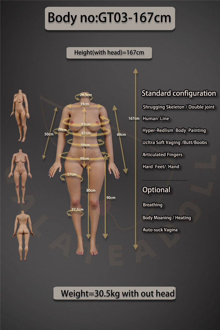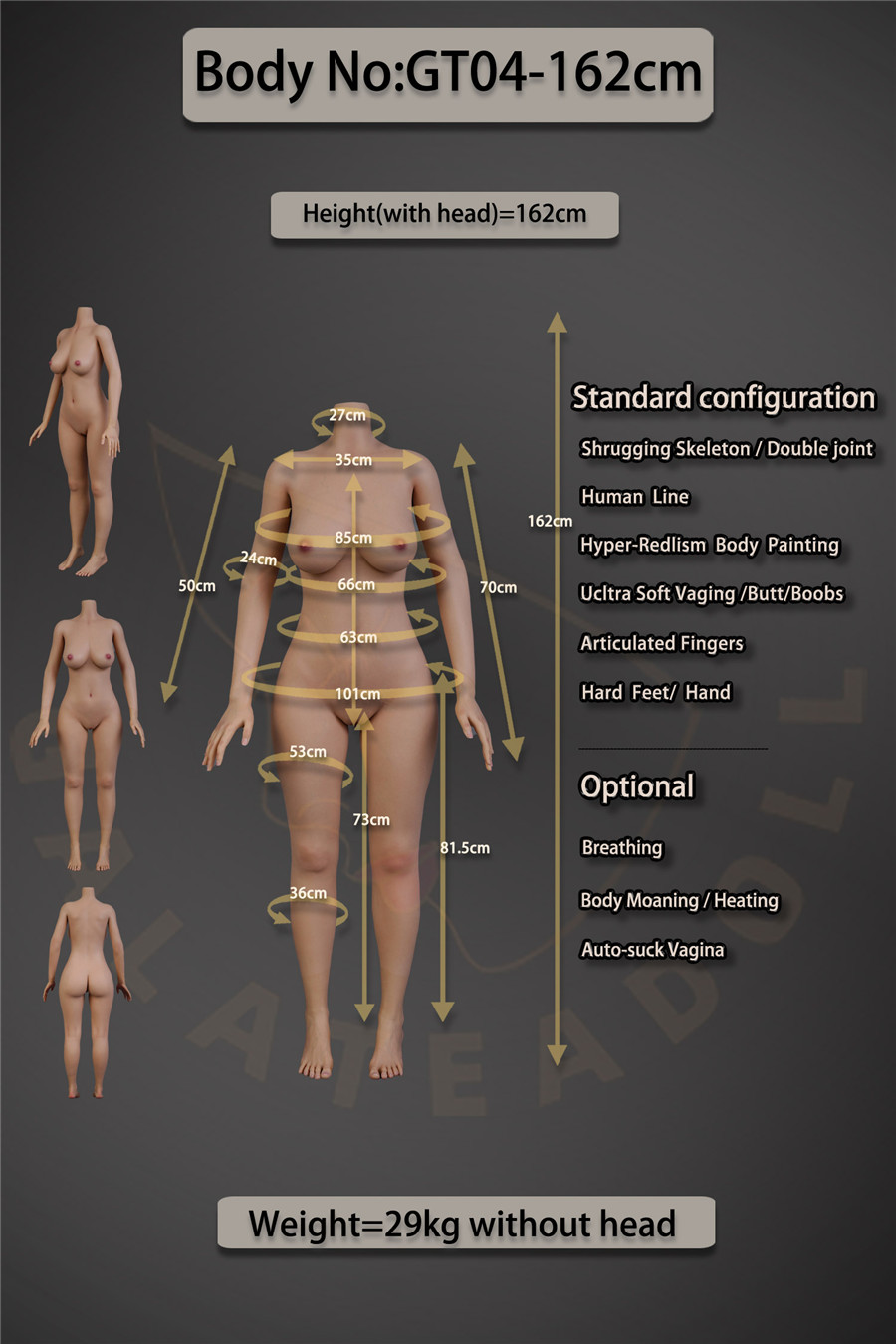 Galatea Doll bietet eine breite Palette an Körpertypen, um unterschiedlichen Vorlieben und Fantasien gerecht zu werden. Derzeit hat die Marke vier verschiedene Körpertypen vorgestellt: GT01-168cm, GT02-163cm, GT03-167cm und GT04-162cm. Jeder Körpertyp ist so gestaltet, dass er die natürlichen Kurven betont, und ist in verschiedenen LHP-Designs erhältlich, sodass Liebhaber die perfekte Übereinstimmung für ihre Wünsche auswählen können.