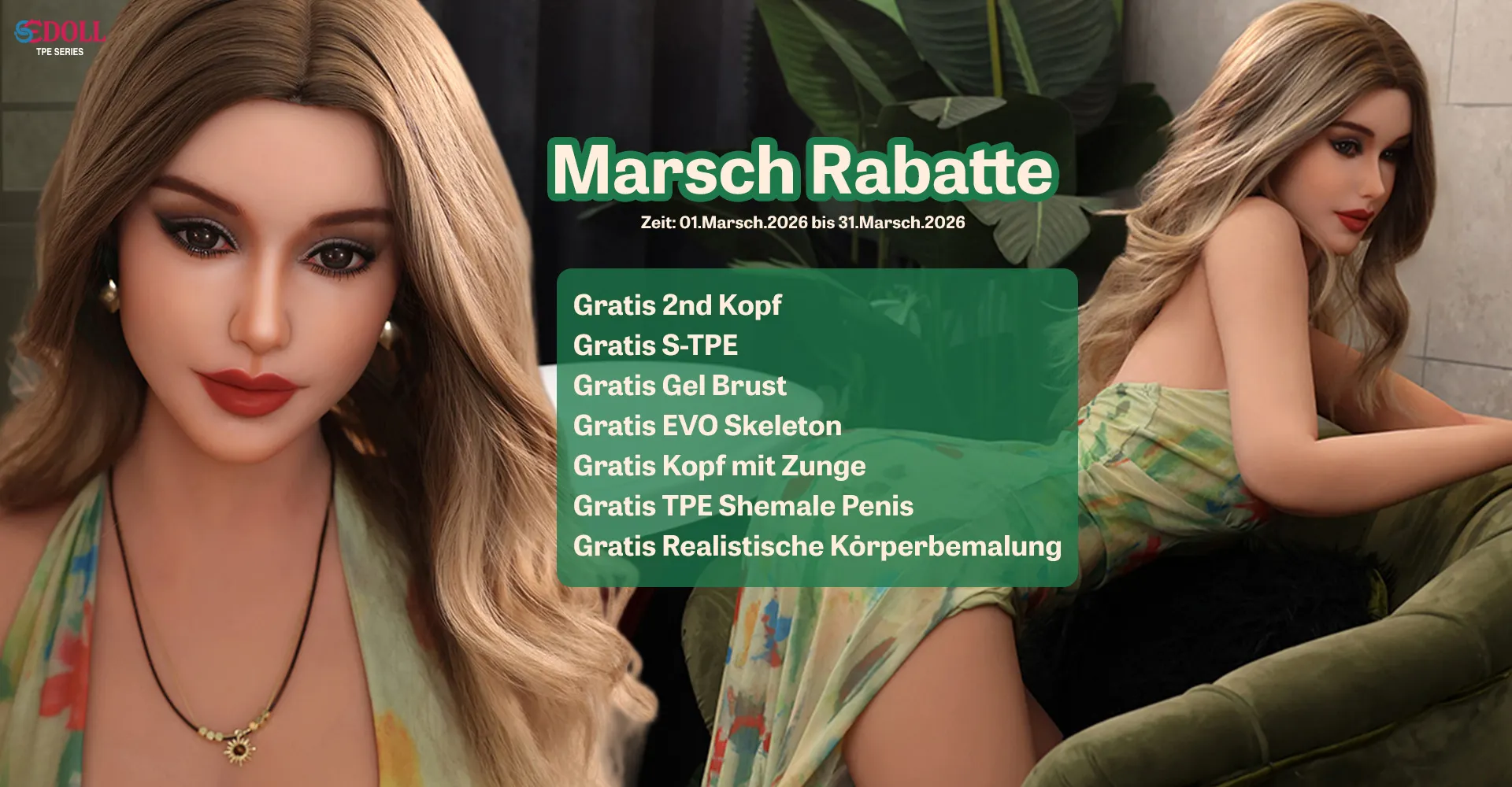 Unsere luxuriösen Liebespuppen bestehen alle aus verschiedenen Materialien, von denen eines TPE ist, diese Material zeichnet sich aus durch eine hohe Weichheit nahe der echten Haut, gute Elastizität, geringes Gewicht und nicht zuletzt ist die Liebespuppe dadurch insgesamt leichter zu bewegen. Jede Liebespuppe kann individuell gestaltet werden, damit sie Deiner erotischen Fantasie entspricht.